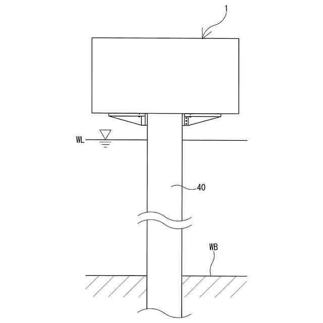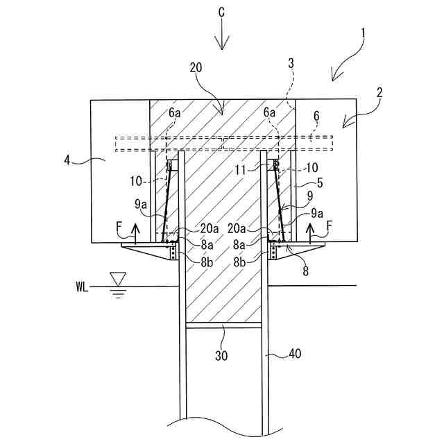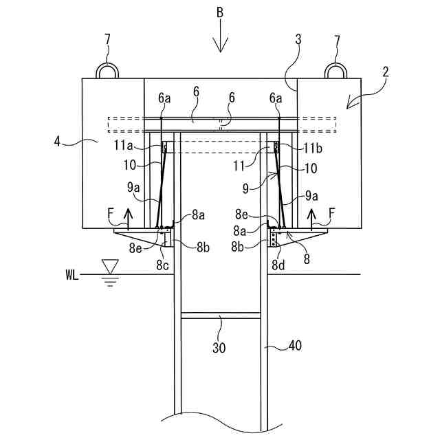 図1に例示するように、本発明は、水底地盤WBに打設された杭や矢板などの支持体40の上部に固定される桟橋や護岸等の水上の上部工1を構築する方法である。支持体40としては、例えば、鋼管杭やコンクリート杭などの杭や、鋼管矢板などの矢板が例示できる。以下に説明する図1~図7に例示する実施形態では、支持体40が杭である場合を例示する。