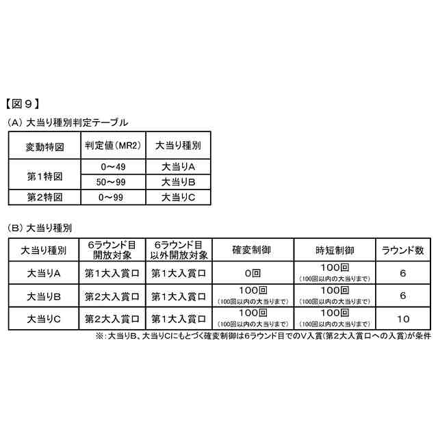 特徴部1のパチンコ遊技機における(A)は大当り種別判定テーブルを示す説明図であり、(B)は大当り種別の説明図である。