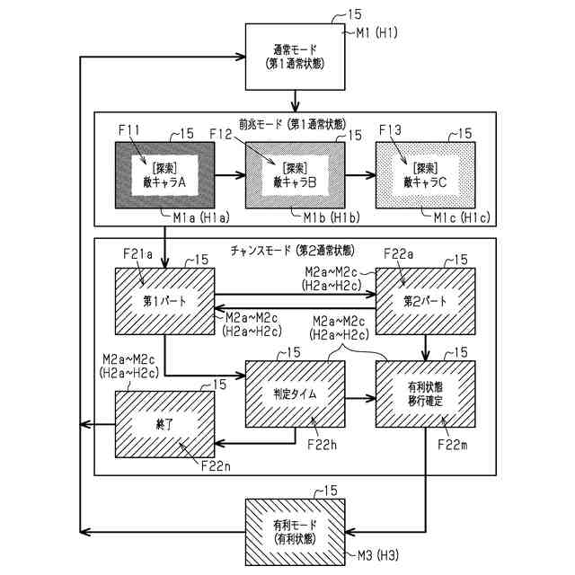 【解決手段】演出実行手段(一例として表示演出装置15)は、特別演出(一例としてチャンスモード)を実行可能であり、特別演出は、第1パートと、第2パートと、を含んで構成され、第1パートに滞在中、特定図柄(一例として対応役)を停止表示可能であり、第1パートにおける特定図柄の停止表示に応じて、第2パートへ移行し、第2パートでは、有利状態への移行契機となり得る図柄が第1図柄であるときと、第2図柄であるときとで、有利状態への移行契機となりうる図柄の停止表示の発生期待度が異なる。