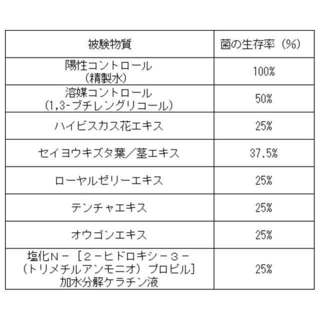 ハイビスカス花エキス、セイヨウキズタ葉/茎エキス、ローヤルゼリーエキス、テンチ