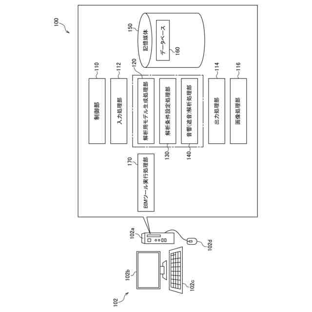 BIMモデルは、建造物の構造及び仕様を3次元データで表したものであり、設計段階で作成されている。BIMモデルを使用することにより、ここから生成した解析用モデルにおいても、建造物の各部屋の面積や容積、サッシ間の距離等を簡便に利用することができる。また、解析用モデルの生成にBIMモデルを使用することで、建造物の界壁の構造や界床・天井の構造等も容易に利用することができる。これにより、実際の建造物内で音が伝搬する場合と同様の条件での音響解析が可能となり、算出結果の信頼性を高めることができる。