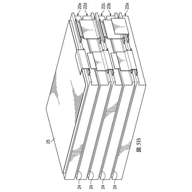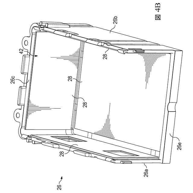 図4Bを参照すると、図示の実施形態では、内部ハウジング26は、同様に、少なくとも1つの開口部42を部分的に画定する3つの壁26a、26b、26cを含む。図示の実施形態では、圧縮性ライニング28は、3つの壁26a、26b、26cのそれぞれの内面及び内部ハウジング26の底部部分26eの上面に(例えば、接着剤を用いて)付着される。いくつかの実施形態では、内部ハウジング26は、少なくとも1つの開口部42を画定する第4の壁としてエンドプレート26eを含む(図4Cを参照されたい)。いくつかの実施形態では、圧縮性ライニング28は、エンドプレート26eの内面及び/又は一番下のパウチセル22a(図5B)に付着される。いくつかの実施形態では、圧縮性ライニング28は、発泡体を含む。いくつかの実施形態では、圧縮性ライニング28は、電解液漏れを緩和し、衝撃を受けるシナリオにおいてパウチのシームを保護する。いくつかの実施形態では、圧縮性ライニング28は、上面及び底面の両方に接着剤を含み、接着剤は、圧縮性ライニング28の両面、壁26a、26b、26c、底部部分26e又はエンドプレート26e及びパウチセル22a~22eの積層体(図5B)に付着する。