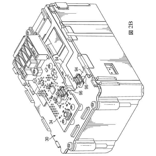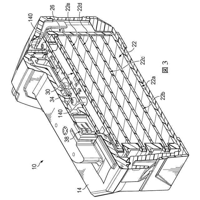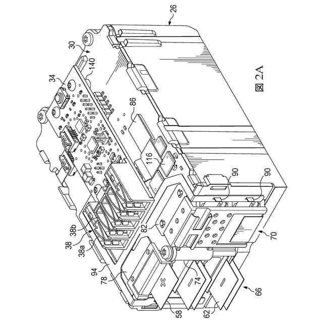 図2及び図3に示すように、バッテリパック10は、複数のパウチセル22、第1のPCB30、第2のPCB34及び端子38を収容する内部ハウジング26(コアボックスとも呼ばれる)を含む。図4Aを参照すると、図示の実施形態では、内部ハウジング26は、少なくとも1つの開口部42を部分的に画定する3つの壁26a、26b、26cを含む。更に図2Aを参照すると、第1のPCB30は、内部ハウジング26の3つの壁26a、26b、26cに接触する。換言すれば、第1のPCB30は、第1のPCB30が内部ハウジング26の表面を形成するように、少なくとも1つの開口部42を実質的に覆う。再び図2及び図3を参照すると、第2のPCB34は、第1のPCB30のうち、パウチセル22の側と反対の側に配置される。別の言い方をすれば、第1のPCB30は、パウチセル22と第2のPCB34との間に配置される。端子38は、第2のPCB34に取り付けられ、出力ポート18(図1)からの電流をデバイスに出力するために出力ポート18(図1)と整列するように配置される。
