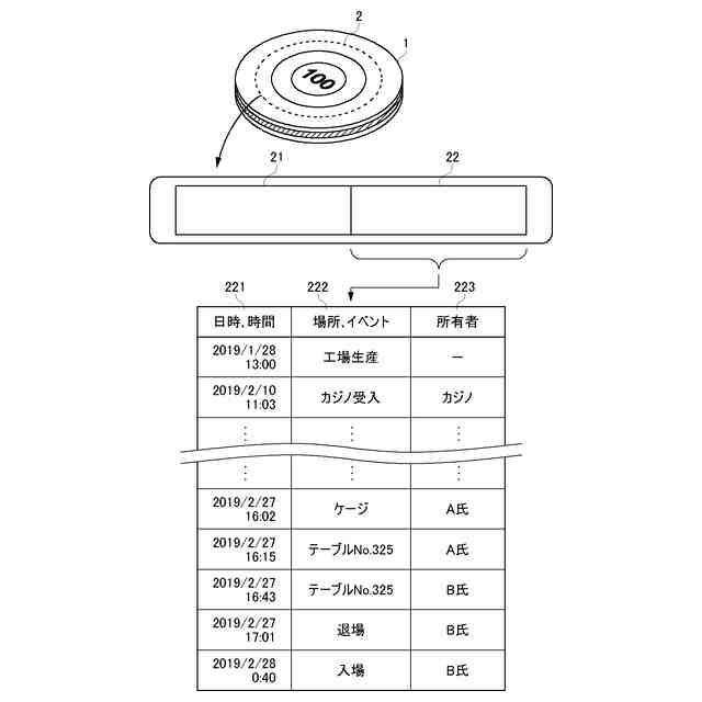 従来技術に基づく遊技用代用貨幣では、RFIDの読取により、メモリー領域に書き込まれた情報を把握して遊技用代用貨幣そのものの真贋を判定することは可能であった。しかしながら、カジノの現場で使用される中で得られる情報、特に当該遊技用代用貨幣の所有者に関する情報を記録、判定することはできなかった。そのため、真正な遊技用代用貨幣であるが、本来の所有者とは異なる所有者によって使用や交換がなされている等、使用状況の点で異常な履歴をもつ遊技用代用貨幣は、その存在をRFIDの読取により把握することができず、そのような使用履歴がおかしい遊技用代用貨幣がカジノで使用されることを防ぐことができなかった。