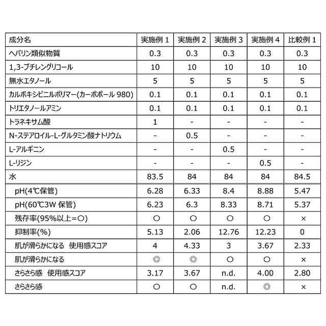 本発明者らは、上記課題を解決するために鋭意研究した結果、ヘパリン類似物質を含有する外用組成物において、トラネキサム酸及びその塩、アシルアミノ酸、その誘導体及びそれらの塩、アルギニン、その誘導体及びそれらの塩、リジン、その誘導体及びそれらの塩からなる群より選択される1種以上のアミノ酸成分を含有させることにより、外用組成物中のヘパリン類似物質の安定性を向上させることができることを見出した。