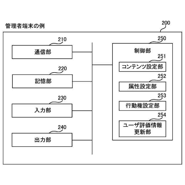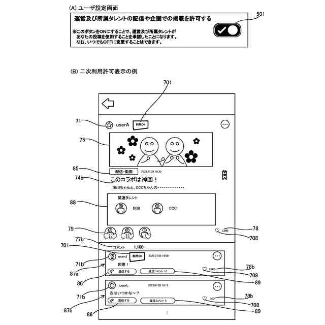 ユーザから受け付けたアクションが二次利用されること(例えば、運営者やタレントなどが、ユーザの投稿コンテンツを動画配信で紹介することや、投稿コンテンツ内で引用することなど)を、当該ユーザからの操作(例えば、図28(A)のユーザ設定画面における二次利用許否ボタン501の操作、図32のコンテンツの投稿時の二次利用許否ボタン501の操作、変形例の(投稿後のコンテンツ毎の二次利用許否情報の変更について)など参照)に応じて許可するか否かを設定するための手段(例えば、アカウント管理部133、入力情報送信部353、図30のステップS601~S604など)と、