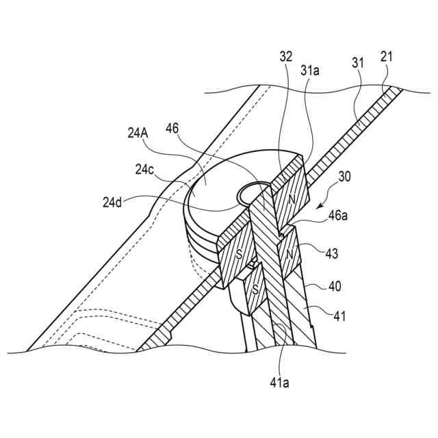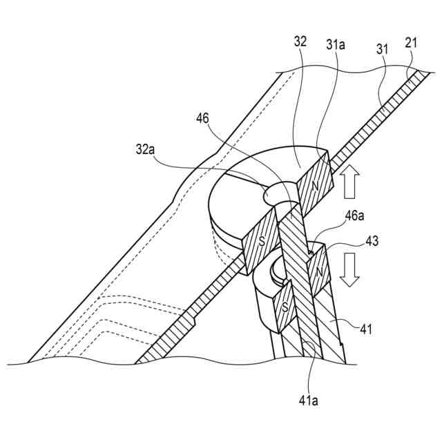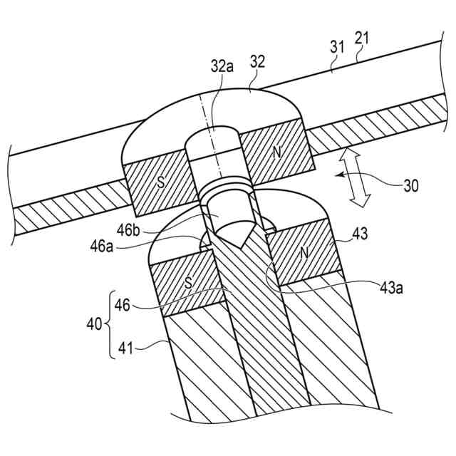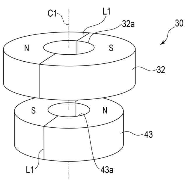 前記第1の磁性体及び前記第2の磁性体は、中心に孔部を有する円環状に構成され、 前記第1軸は、軸体と、軸体の先端部に設けられるとともに、前記孔部に配され、前記第1の磁性体を、前記軸体に回転可能に支持し、前記第1の磁性体の回転の径方向の移動を規制する支持部材と、を備え、