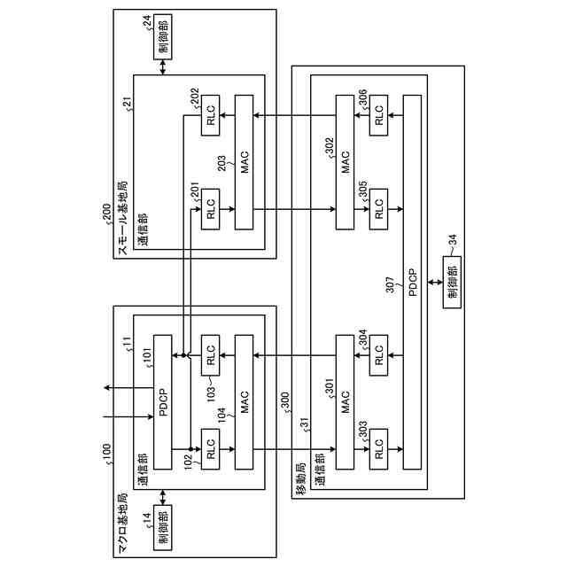 2元接続におけるプライマリ基地局及びセカンダリ基地局への機能分担については、データプレーンの信号をどのレイヤで分岐させるかにより、様々な構成が提案されている。例えば、PDCP(Packet Data Convergence Protocol)レイヤの前段でデータプレーンの信号を分岐させる構成がある。また、例えば、PDCPレイヤとRLC(Radio Link Control)レイヤの間でデータプレーンの信号を分岐させる構成がある。また、例えば、RLCレイヤとMAC(Medium Access Control)レイヤの間でデータプレーンの信号を分岐させる構成がある。これらに限らず、各レイヤ内でデータプレーンの信号を分岐させる構成も可能である。また、例えば、PDCPレイヤの一部の機能はプライマリ基地局に割り当て、PDCPレイヤの残りの機能はセカンダリ基地局に割り当てるという構成も可能である。これは、RLCレイヤ及びMACレイヤの機能についても同様である。なお、LTE-Aの最新動向では、PDCPレイヤとRLCレイヤの間でデータプレーンの信号を分岐する構成(Architecture 3C)と、マスター基地局およびスモール基地局それぞれがPDCPレイヤ、RLCレイヤ、MACレイヤを有する構成(Architecture 1C)を採用することになっている。