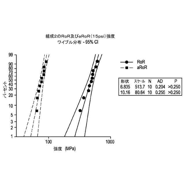 の破壊靭性値を示す。例えばイオン交換プロセスによる化学的強化は、ガラス又はガラスセラミックに、表面からある深さ(例えば50~100μm)まで、圧縮応力層を付与することにより、上記ガラス又はガラスセラミックの上記表面における割れの貫入に対するある程度の耐性を提供できるが、割れ貫入耐性は限定される場合があり、割れが上記圧縮応力層を通ってガラス又はガラスセラミックの体積内に貫入した後ではもはや有効でなくなる。上記強化は、割れの貫入に対するある程度の耐性を提供するものの、材料の固有の特性(k1c)はイオン交換によって影響を受けない。特に損傷耐性及び破壊靭性に関する、ガラス系材料の機械的特性の改善には、焦点が当てられ続けている。従って、改善された損傷耐性及び破壊靭性を材料に提供することが必要とされている。