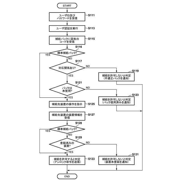 ここで、補給方式の一つとして、収容デバイスからプリンタへトナーを一括して補給する方式を出願人は検討している。しかしながら、この場合、ユーザが誤って契約対象ではない別のプリンタにトナーを補給してしまうと、プリンタの内部から補給済みのトナーを回収することは困難であり、またサブスクリプションサービスの管理が煩雑になるという課題が発生する。