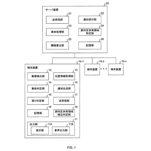 請求項1に記載の発明は、移動体から前記移動体に事故が発生したと判定されたことを示す事故判定情報及び当該事故が発生したとされた地点を示す発生地点情報を含む事故通知を受け付ける事故通知受付部と、前記事故通知を取り消すための取消通知を受け付ける取消通知受付部と、前記取消通知によって取り消された事故通知に含まれる発生地点情報を記録し、当該記録された発生地点情報に基づいて取消通知多発領域を特定する領域特定部と、を含むことを特徴とする。