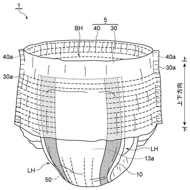 上述したようなパンツ型吸収性物品の装着時においては、筒状の胴回り部(ベルト)の引き上げ動作が実施される。ここで、ベルトの引き上げ動作によっても、吸収性本体の内、ベルトに重ならない(ベルトより下端の)股下部等の領域については、引き上げる力が伝わりづらく、引き上がり難い。股下部が十分に引き上がらないことにより、モレ等が発生するおそれがある。