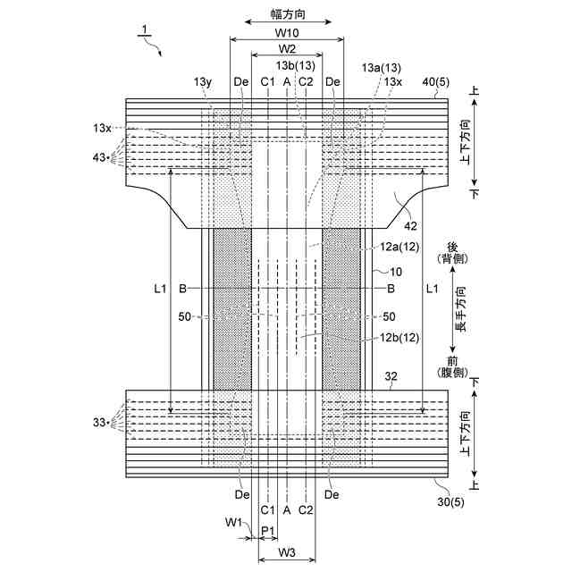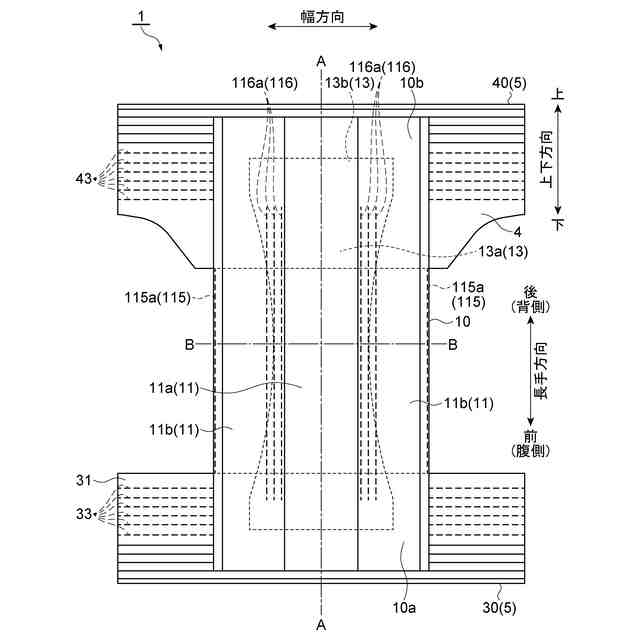 複数の股間用弾性部材は、中央線を基準として、腹側胴回り部側又は背側胴回り部側に偏倚して配置されていてもよい。吸収性コアについては、腹側胴回り部側及び背側胴回り部側の一方が引きあがりにくい場合がある。この点、腹側胴回り部側及び背側胴回り部側の内、引き上がりにくい側に偏倚して股間用弾性部材が配置されることにより、股間用弾性部材を介して、引き上がりにくい側を重点的に引き上げることができる。そして、股間用弾性部材が腹側胴回り部側に偏倚して配置されることにより、吸収性コアの股間部付近のフィット性を向上させることができる。また、股間用弾性部材が背側胴回り部に偏倚して配置されることにより、寝姿勢での後ろ身頃の引き上げやすさを向上させることができる。