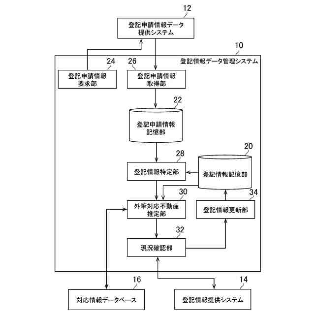 特定される前記受付年月日及び前記受付番号により識別される第2の登記申請情報に外筆情報が記録されており、当該第2の登記申請情報に登記申請の対象となる不動産を特定可能な情報が示されている不動産が、前記第1の登記申請情報に登記申請の対象となる不動産を特定可能な情報が示されている不動産と異なる場合に、当該第2の登記申請情報に登記申請の対象となる不動産を特定可能な情報が示されている不動産を、前記外筆情報に対応付けられる不動産として推定する外筆対応不動産推定手段と、