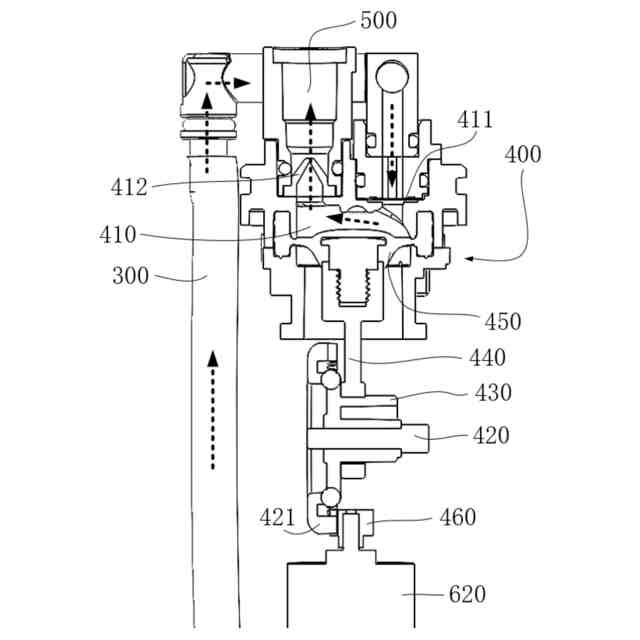 前記ポンプアセンブリ(400)は圧力チャンバ(410)を含み、前記圧力チャンバ(410)の一端が前記導水管(300)に接続されるとともに、前記回転弁(100)内の液体が前記圧力チャンバ(410)に導入され、前記導水管(300)と前記圧力チャンバ(410)との間に第1一方向弁(411)が設置され、