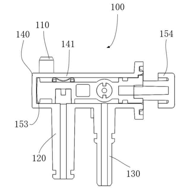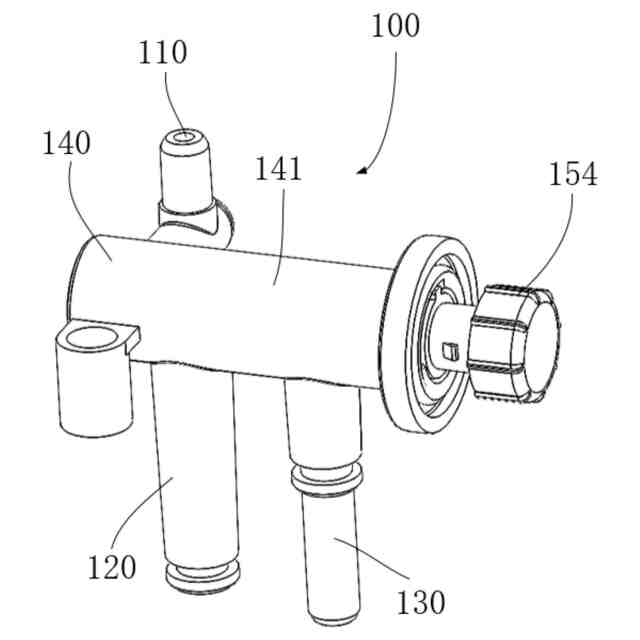 前記回転弁(100)は弁体(140)を含み、前記弁体(140)は主部(141)及び前記主部(141)上から延在する前記第1入口部(120)、前記第2入口部(130)及び前記出口部(110)を含み、前記第1入口部(120)及び前記第2入口部(130)は前記主部(141)の周面に位置し、かつ、前記第1入口部(120)及び前記第2入口部(130)の前記主部(141)の周方向における位置は同一であり、軸方向に並列に設置され、