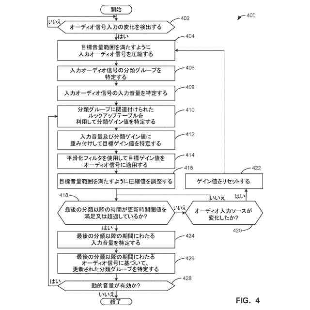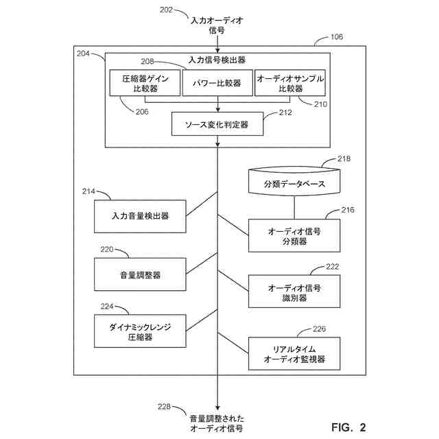[0010]従来のオーディオメディアの実装では、異なるメディアに関連付けられたオーディオ信号は、異なる音量を有する場合がある。たとえば、あるCDのメディアは、他のCDのメディアとは大幅に異なる音量で録音及び/又はマスタリングされる場合がある。同様に、ストリーミングデバイスから取得されるメディアは、異なるデバイスから取得されるメディア、又は同じデバイスから異なるアプリケーションを介して取得されるメディアとは大幅に異なる音量レベルを有する場合がある。ユーザがますます様々な異なるソースからのメディアを聞くようになると、ソース間及び同じソースのメディア間の音量レベルの違いが非常に顕著になり、聴取者を苛立たせる可能性がある。