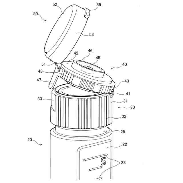 この課題を解決するため、請求項1に係る本発明は、所定量の希釈液を収容可能な容器本体と、容器本体の開口端に取り付けられる略筒状のベースキャップと、ベースキャップに第一ヒンジで開閉可能に連結される中蓋と、中蓋に第二ヒンジで開閉可能に連結される上蓋とを有し、ベースキャップを容器本体に取り付けると共に中蓋をベースキャップに対して閉じたときに容器本体の内部に連通する連通口が中蓋の天面を貫通して設けられ、上蓋を中蓋に対して閉じたときに中蓋の連通口を密栓する突起が上蓋の天面から下方に突出して設けられることを特徴とする希釈液収容容器である。