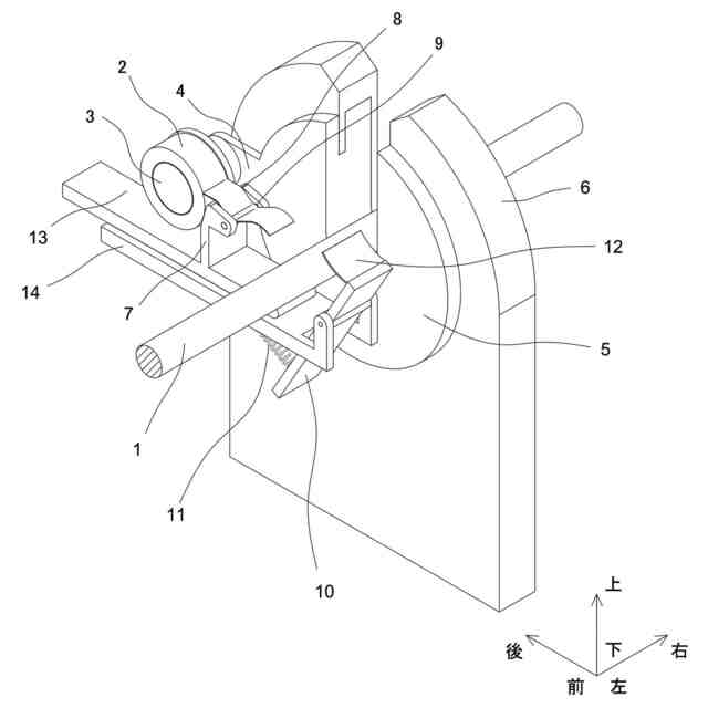 テープ引出機は、ロールテープから延びるテープ端を保持し、テープを引き出すものである。なお、「テープを引き出す」とは、ロールテープに巻回された粘着テープを、先に繰り出されたテープを保持して引張り、繰り出すことをいう。