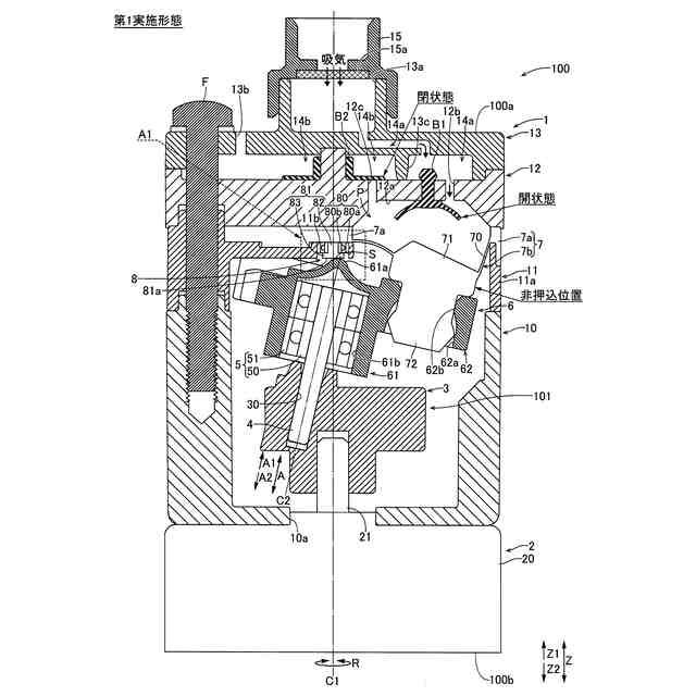 この発明の第2の局面によるダイヤフラムポンプでは、上記のように、傾斜シャフトが偏心して回転する際の支点となる支点部を有し、軸受を介して傾斜シャフトに取り付けられ、回転中心軸線周りの傾斜シャフトの偏心回転に伴い揺動して、ダイヤフラムを繰り返し押圧して弾性変形させる揺動体と、傾斜シャフトに対する軸受の相対位置の変動を規制するように相対位置を固定する相対位置固定部とを備える。これによって、相対位置固定部により、傾斜シャフトに対する軸受の相対位置の変動を規制して、軸受を介して、傾斜シャフトに対する揺動体の相対位置の変動を規制することができる。これにより、揺動体が傾斜シャフトの軸方向に移動するのを抑制することができるので、揺動体の支点部とハウジングとの接触箇所における互いの押圧力(接触圧力)を低減することができる。すなわち、揺動体の支点部とハウジングとの間の接触を弱めることができる。その結果、揺動体の支点部とハウジングとの接触箇所における摩耗を抑制することができる。特に、ダイヤフラムポンプにより真空状態を作り出す際に、ポンプ室の真空度が高くなると、揺動体の支点部とハウジングとの接触箇所における接触圧力が増加して摩耗が発生しやすくなるため、接触箇所の接触圧力を弱めることが可能である本発明は有効である。