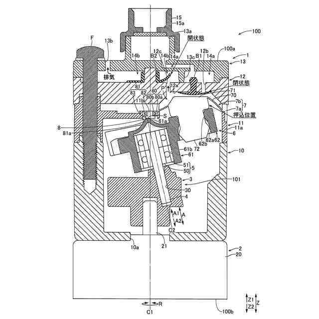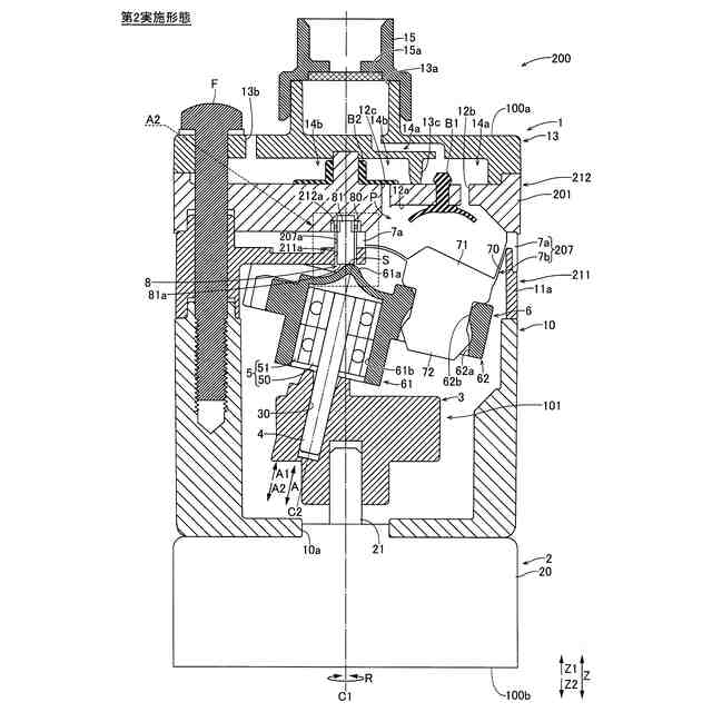 モータの駆動力により所定の回転中心軸線周りに偏心状態で回転され、前記回転中心軸線に対して傾斜した状態で配置された傾斜シャフトと、