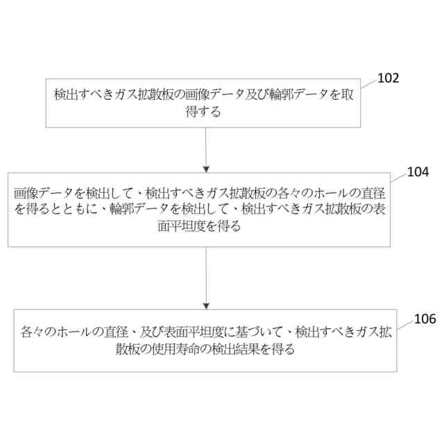 本願の実施例の第一局面によれば、ガス拡散板検出方法であって、複数のホールを有する検出すべきガス拡散板の画像データ及び輪郭データを取得することと、前記画像データを検出して、前記検出すべきガス拡散板の各々のホールの直径を得るとともに、前記輪郭データを検出して、前記検出すべきガス拡散板の表面平坦度を得ることと、各々のホールの直径、及び前記表面平坦度に基づいて、前記検出すべきガス拡散板の使用寿命の検出結果を得ることとを含む、ガス拡散板検出方法を提供している。