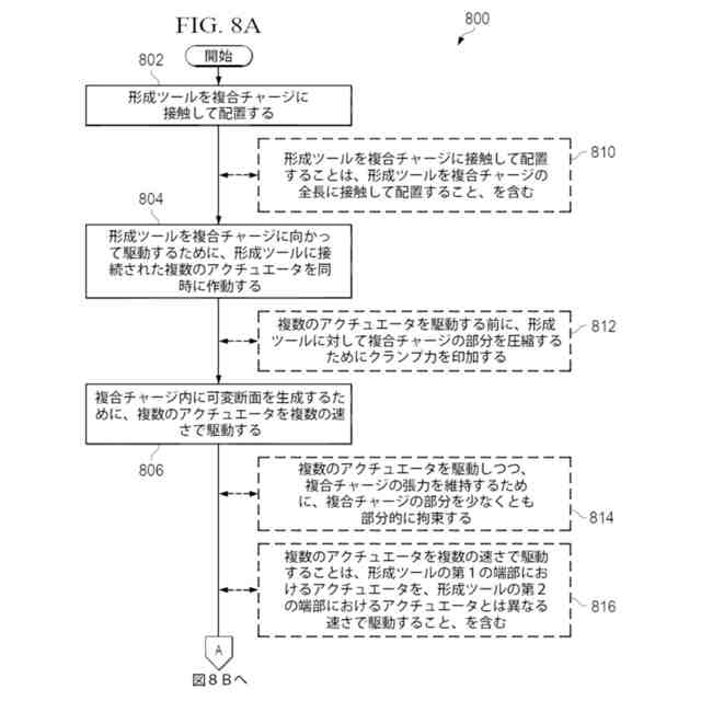 【解決手段】複合チャージをパンチ形成する方法が提示される。形成ツールが、複合チャージと接触して配置される。形成ツールに接続された複数のアクチュエータが、複合チャージに向かって形成ツールを駆動するために、同時に作動する。複数のアクチュエータは、複合チャージ内に可変断面を生成するために複数の速さで駆動する。複数のアクチュエータは同時に停止する。