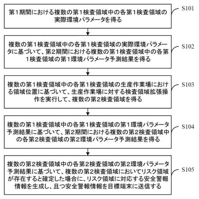 【解決手段】該方法は、第1期間における複数の第1検査領域中の各第1検査領域の実際環境パラメータを得ることと、各第1検査領域の実際環境パラメータに基づいて、第2期間における各第1検査領域の第1環境パラメータ予測結果を得ることと、各第1検査領域の生産作業場における領域位置に基づいて、複数の第2検査領域を得ることと、各第1検査領域の第1環境パラメータ予測結果に基づいて、第2期間における複数の第2検査領域中の各第2検査領域の第2環境パラメータ予測結果を得ることと、各第2検査領域の第2環境パラメータ予測結果に基づいて、複数の第2検査領域においてリスク領域が存在すると確定した場合に、リスク領域に対応する安全警報情報を生成することと、を含む。