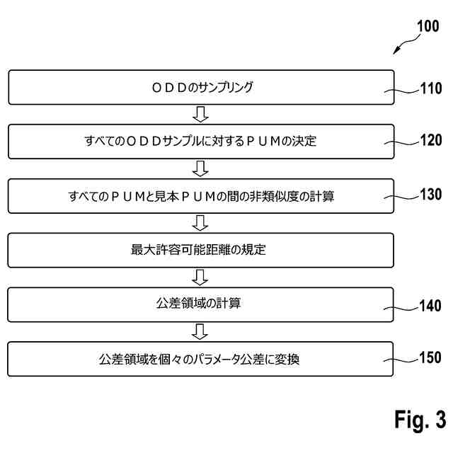 【解決手段】多数のペアのそれぞれのペアで非類似度メトリックを計算するステップを含み、それぞれのペアが、目標パラメータサンプルに割り当てられたパラメータ化されたシミュレーションモデルと、多数のパラメータ化されたシミュレーションモデルのそれぞれ1つのパラメータ化されたシミュレーションモデルとを含み、ペアごとに1つの距離が生じ、これにより多数の距離が生じ;任意選択で、非類似度メトリックが、gapメトリック、ν-gapメトリック、またはL2メトリックをベースとし;かつ多数の距離および最大許容可能距離をベースとして、目標パラメータサンプルの周りのODD内の公差領域を決定するステップを含む、方法。