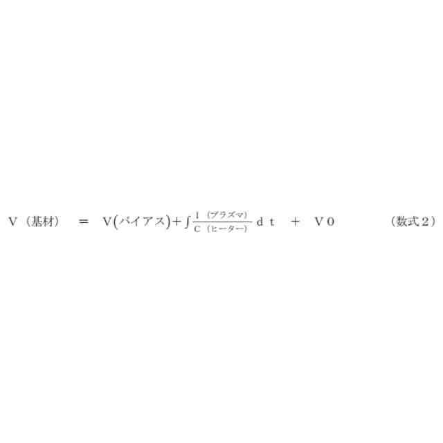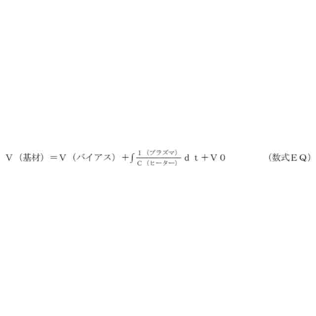 (V(基材):基材上に誘導されるバイアスされた正電圧、V(バイアス):DC供給部から生成される電圧、I(プラズマ):プラズマからヒーターに流れる電流、C(ヒーター):ヒーターの静電容量、V0:基材の初期電圧)。