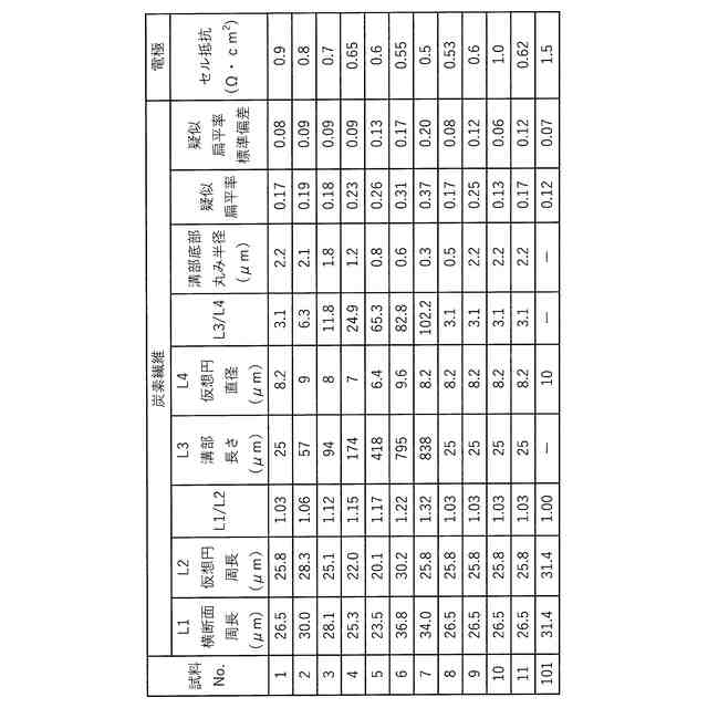 (1)本開示の実施形態に係るレドックスフロー電池用電極は、炭素繊維を含む繊維集合体を備え、前記炭素繊維は、前記炭素繊維の長さに沿って設けられている複数の溝部と、前記溝部の間にあって前記溝部よりも相対的に突出している畝部と、前記炭素繊維の周長が仮想円の周長よりも大きい横断面と、を備え、前記横断面は、前記炭素繊維を前記炭素繊維の長さと直交する平面で切断した断面であり、前記仮想円は、前記横断面の面積に等しい面積を有する真円である。