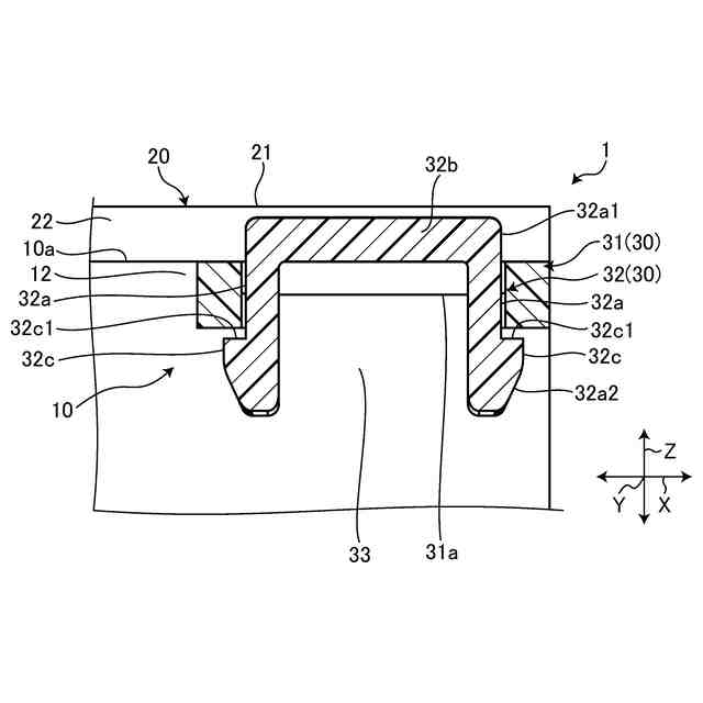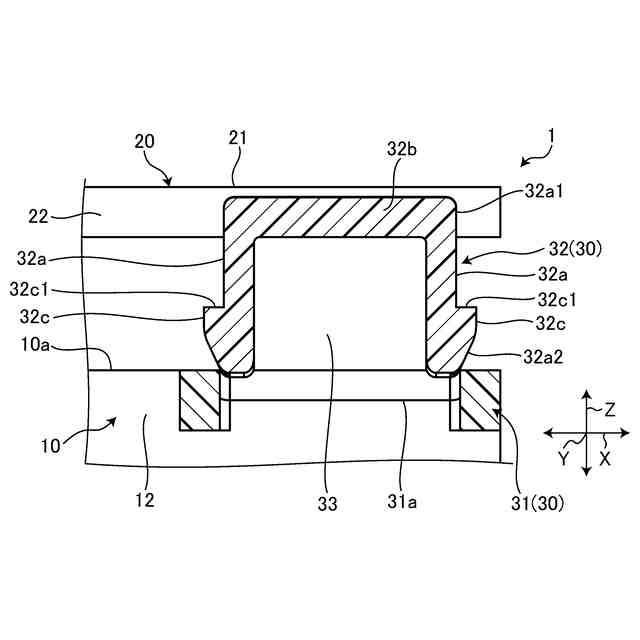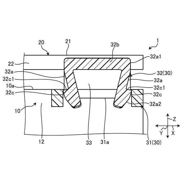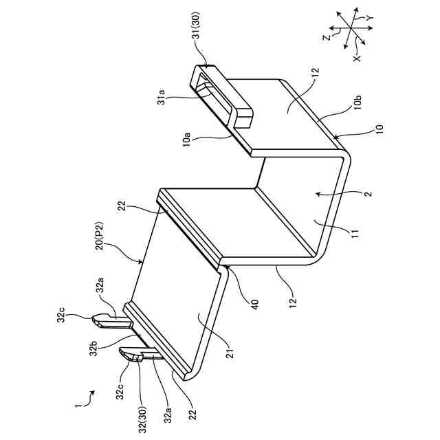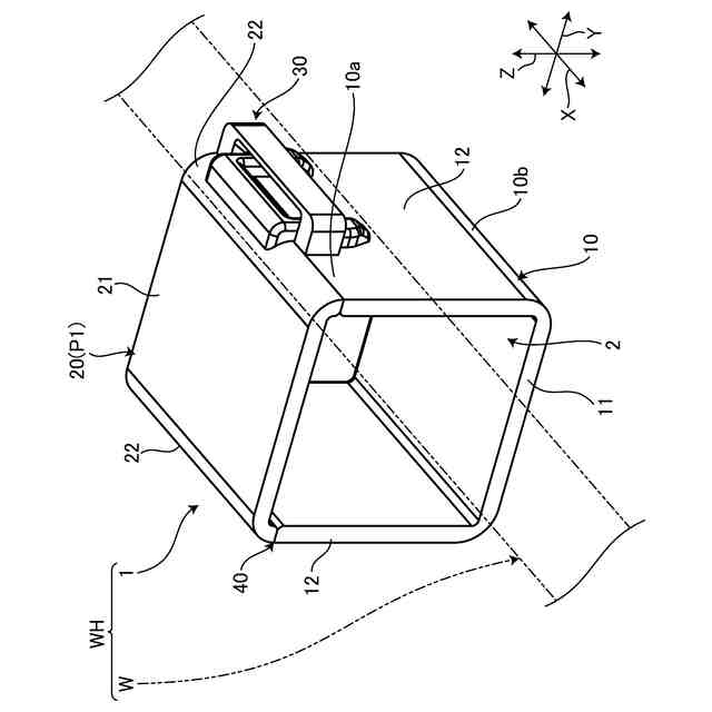 【解決手段】プロテクタ1は、ベース10(第1部材)に設けられるメスロック31と、カバー20(第2部材)に設けられる一対のアーム部32a、一対のアーム部32aの基端部32a1同士を連結する連結部32b及び一対のアーム部32aの先端部32a2に設けられる一対の爪部32cを含んで構成されるオスロック32と、を有するロック部30を備える。オスロック32はさらに、一対のアーム部32a及び連結部32bによって囲われて形成され、組み付け方向Zのベース10側に向けて開口する変形許容空間部33を有し、メスロック31の貫通孔31aへの挿入に伴って一対のアーム部32aが軸線方向X(交差方向)に沿って変形許容空間部33に向けて互いに近づく側に弾性変形可能に構成される。