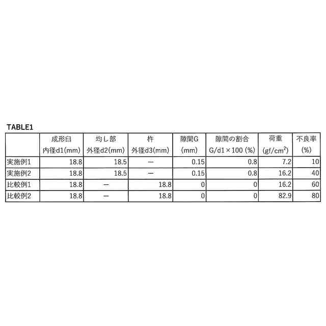 前記成形臼の内径をd1、前記粉体均し具の外径をd2とし、前記隙間を「(d1-d2)/2」で定義したとき、