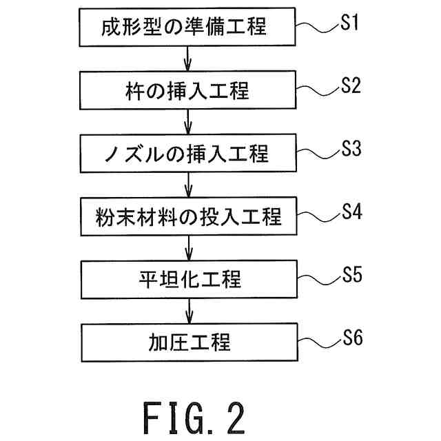 前記粉体均し具を押下げて前記粉体材料を平坦化する工程において、前記粉体均し具と前記成形臼との間には隙間が形成されており、
