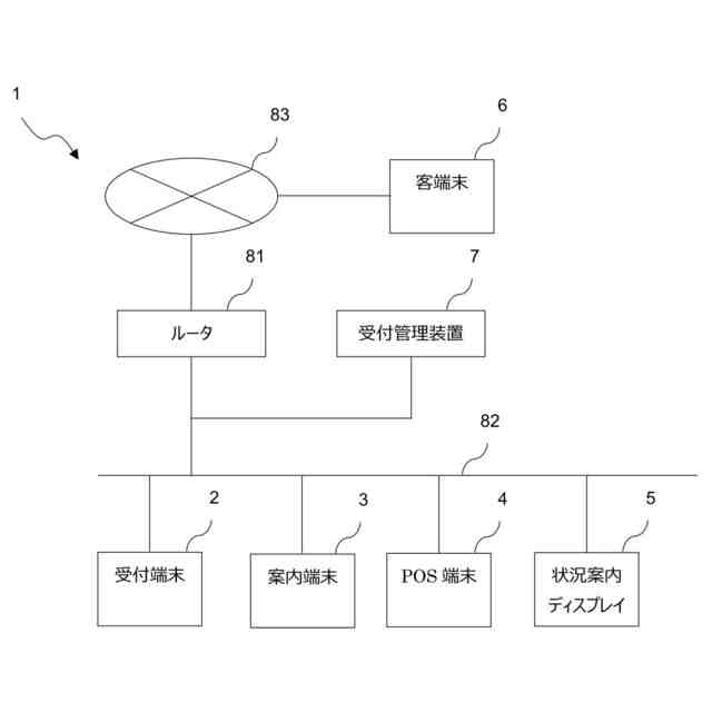 受付端末2、案内端末3、POS端末4、状況案内ディスプレイ5、受付管理装置7は、店舗に備えられる端末又は装置であり、互いにLAN82を介して接続されている。LAN82の接続形態は、有線であってもよいし、無線であってもよい。ルータ81は、店舗に備えられる端末又は装置と、店舗外の装置、例えば本部のサーバや、客が利用する客端末6とのインターネット網83を介する通信を制御(経路選択制御等)する。