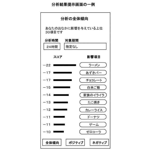 特許文献2に記載の情報処理装置では、ユーザが摂取した食品に関する摂取情報と、ユーザの感情情報、生体情報(排便数の情報を含む)および行動情報のうち1以上の情報または当該情報から導出される実感スコア情報とに基づいて、実感スコアとの間で正または負の相関関係を有する摂取情報を特定し、特定した摂取情報と実感スコアとの間の相関関係に関する情報そのものまたは当該相関関係を用いたアドバイス情報(単位時間当たりの実感スコアを増大させるための仮想摂取情報、不安とストレスのいずれか一方または両方を解消するアドバイスなど)を取得し、取得した情報を表示部に表示する。
