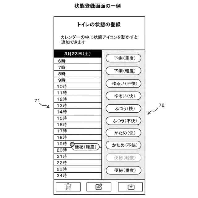 従来、食事や運動などの実行状況を表す行動情報と、身体や精神の状態を表す状態情報とを用いて人の健康状態を分析する技術が知られている(例えば、特許文献1~3参照)。特許文献1に記載の健康管理装置では、便器内の排泄物の性状(形、におい、色)および飲食した食物の情報(昨夜の夕食内容やアルコール等)を便器使用者が入力し、入力された排泄物情報と摂取食物情報を総合演算処理することにより、便器使用者の健康状態を推論する。また、その推論結果から健康状態に対応する食事改善アドバイス情報を出力する。