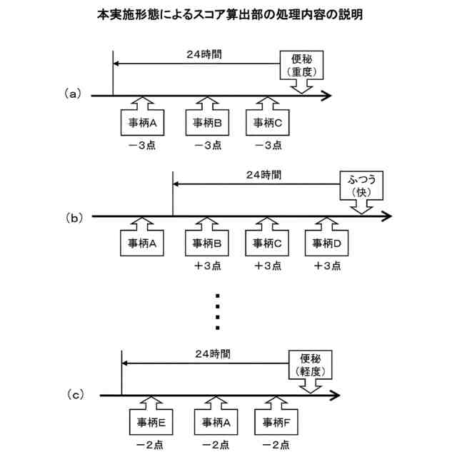 【解決手段】人の身体または精神の状態に影響を与える素因となり得る事柄を示す事柄情報を随時記録する事柄情報記録部15と、人の身体または精神の状態を示す状態情報を随時記録する状態情報記録部16と、当該記録したログ情報に基づいて、状態の発生時点から遡って所定時間以内に発生した事柄に対して、状態の内容に応じて設定された状態別スコアを与え、個々の事柄毎に状態別スコアを合算することによって事柄別スコアを算出するスコア算出部17とを備え、人の身体または精神に生じた状態に影響を与えている素因となる事柄について算出される事柄別スコアが、影響の素因となっていることの傾向を示す値となるようにする。