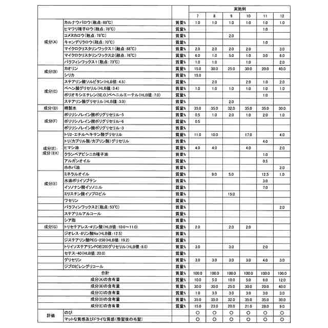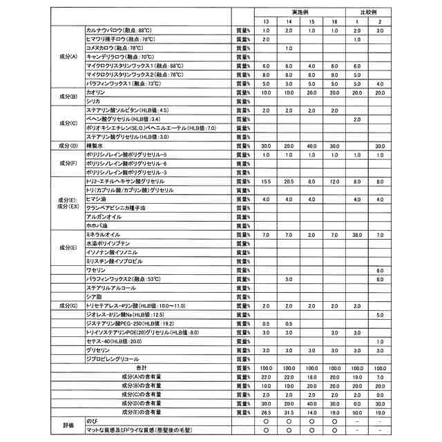 成分EX:植物油及び脂肪酸トリグリセリドからなる群より選ばれる25℃で液状の油性成分