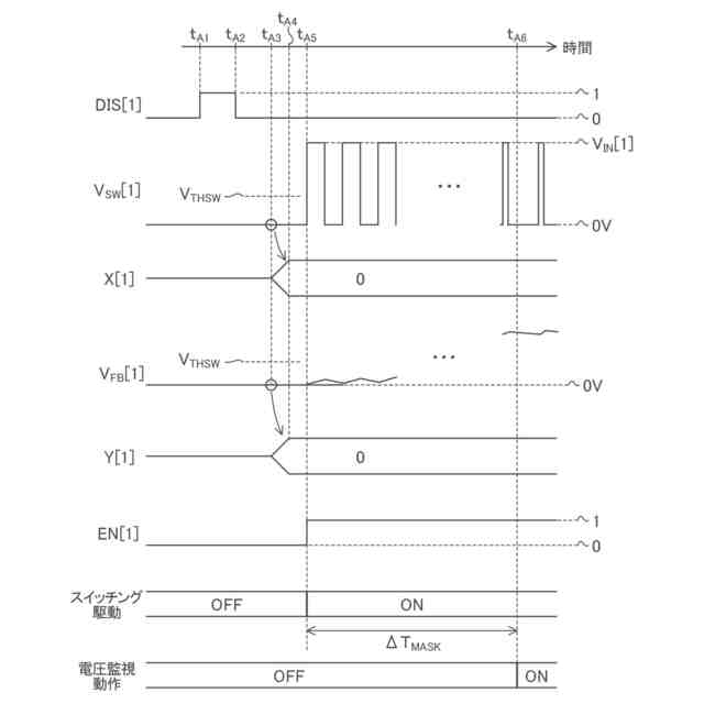 [i])を発生させる。帰還端子(VO[i])に帰還電圧が加わる。コントローラ(20)は、スイッチング駆動が非実行とされる判定タイミングでのスイッチ端子及び帰還端子の各電圧(V