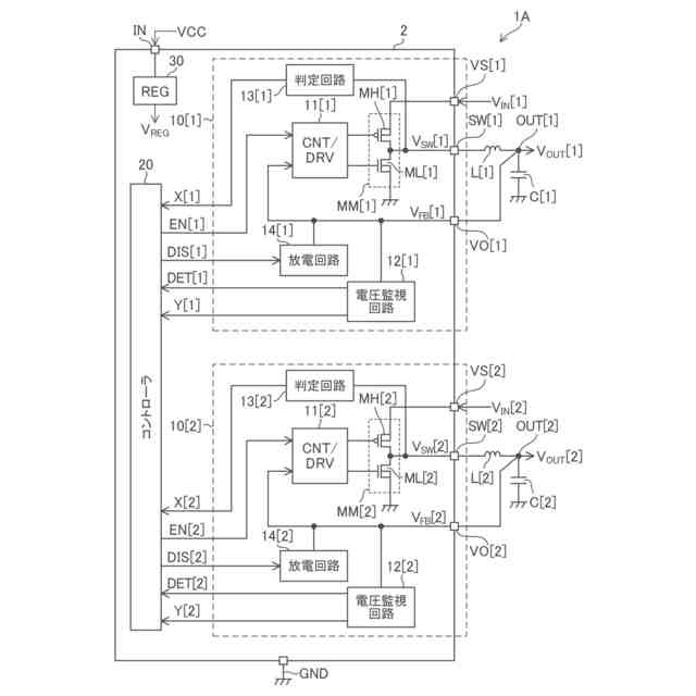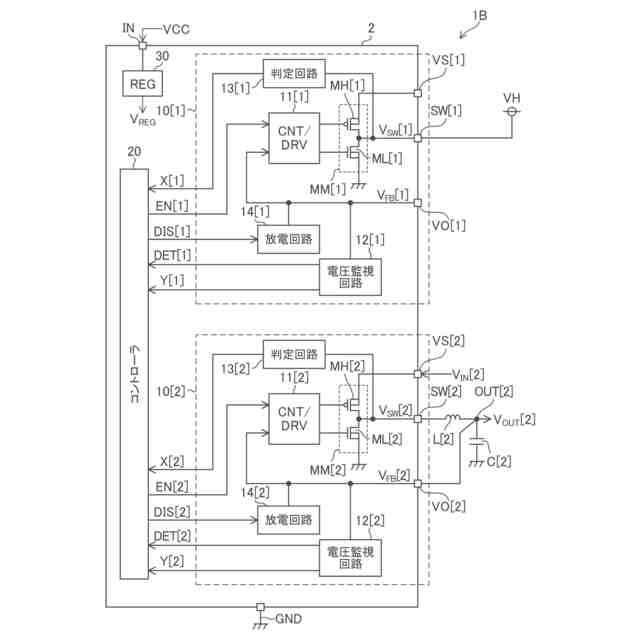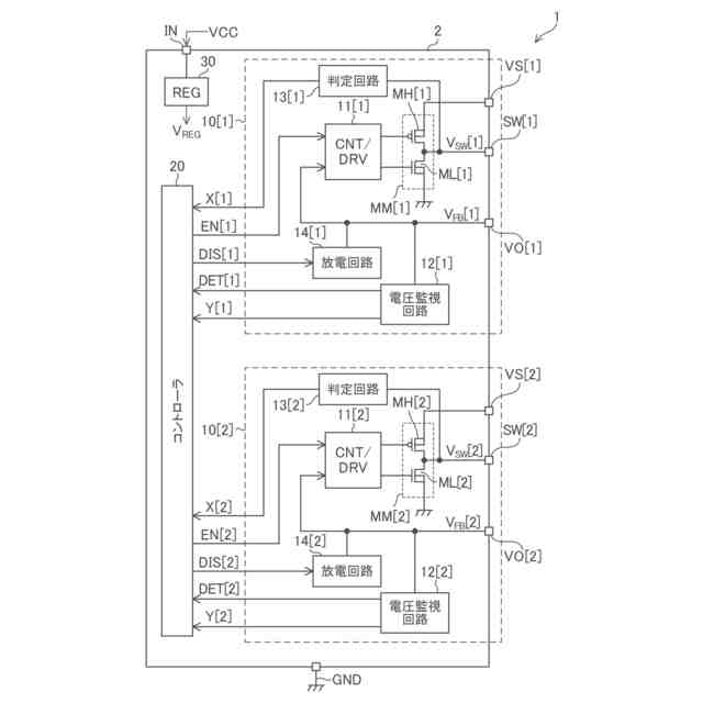 【解決手段】出力段回路(MM[i])は、入力端子及びスイッチ端子間に設けられる出力トランジスタ(MH[i])とスイッチ端子及びグランド間に設けられる整流素子(ML[i])とを有する。出力段回路、出力コイル及び出力コンデンサが設けられる場合に、制御駆動回路(11[i])は帰還電圧(V
