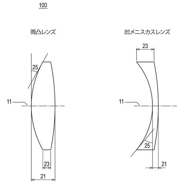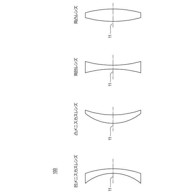 本発明に係る光学ガラスレンズの製造方法で製造した凹メニスカスレンズ、凸メニスカスレンズ、両凹レンズ、または両凸レンズの実施形態の断面を示す模式図である。