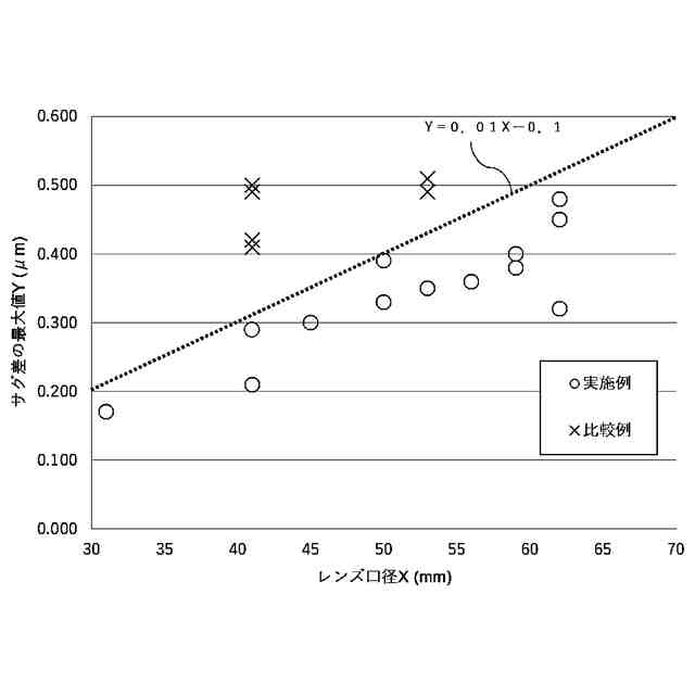 実施例(〇)および比較例(×)の光学ガラスレンズについてのサグ差の最大値Y(μm)とレンズ口径X(mm)との関係を表すグラフである。