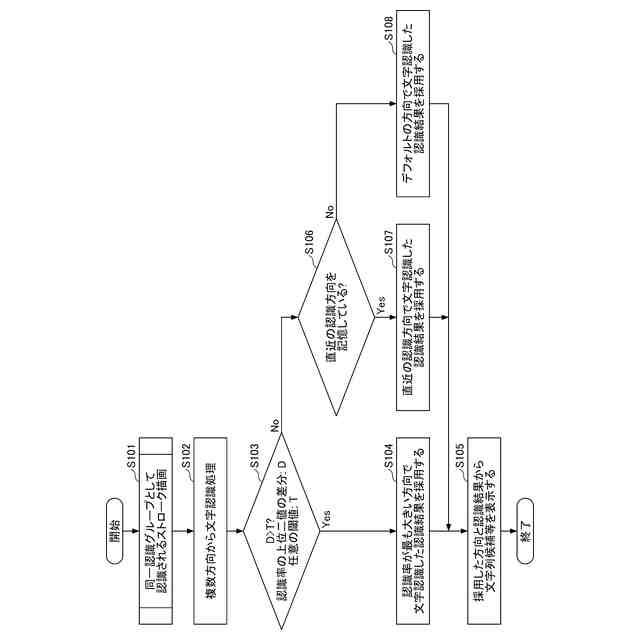 【解決手段】本発明は、手書き入力された手書きデータを複数の方向から文字認識し、複数の方向ごとに認識率を算出する文字認識部と、算出された複数の認識率のうち上位二値の認識率の差分が閾値以上又は閾値超の場合に、認識率が最も大きい方向を、手書き入力の認識方向に決定し、算出された複数の認識率のうち上位二値の認識率の差分が閾値より小さい場合に、文字認識部は、差分が前記閾値より小さいと判断された手書きデータに新たに入力を受け付けた手書きデータを含めて、複数の方向ごとに認識率を算出し、算出された認識率のうち上位二値の認識率の差分が閾値以上又は閾値超の場合に、認識率が最も大きい方向を、手書きデータの認識方向に決定する認識方向決定部と、決定された認識方向で手書きデータを文字認識する。