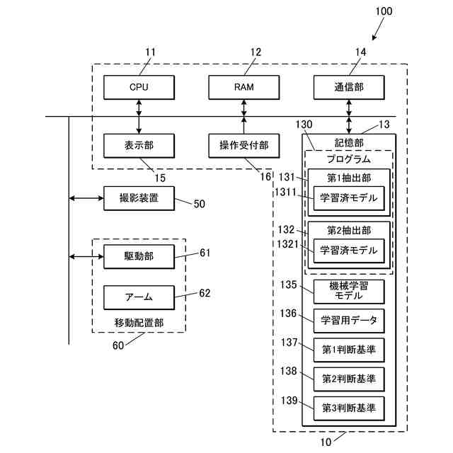 この物品取得配置システム100は、ばら積みされた部品から対象物品であるワークをアーム62で把持して規定された位置に移動させて配置するピックアンドプレースシステムである。物品取得配置システム100は、移動制御装置及び学習用データ生成支援装置としての情報処理装置10、撮影装置50及び移動配置部60(移動動作機構)を含む。