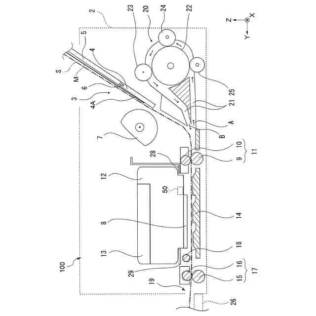 Y軸は、記録装置1の設置面に対して平行な軸であり、記録装置1の奥行き方向に対応している。Y軸に平行な+Y方向は、記録装置1の正面を正対して見たときに、記録装置1の背面側から正面側に向かう方向である。Y軸に平行な-Y方向は、+Y方向の反対の方向である。記録装置1において、+Y方向側は、正面側であり、-Y方向側は、背面側である。なお、記録装置1において、媒体Mが搬送されていく搬送方向を下流とも称し、これと反対の方向を上流とも称する。