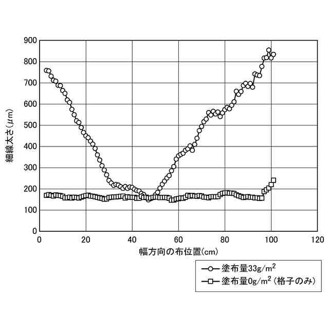 図6は、搬送方向と平行に4つ並べられたインク吐出部で、搬送方向に伸びる線あるいは点を、記録媒体である搬送方向50cm×幅方向100cmの布に印字した際の、幅方向の印字位置と線幅の関係をまとめたグラフである。図6のグラフにおいて、横軸は記録媒体の幅方向の端部からの位置を示す。また、図6のグラフにおいて、縦軸は線幅、すなわち、インクの着弾ズレ量を示す。線を印字すると、点を印字する場合よりも記録媒体の吸水量が増えるため、伸縮量が多くなり、図6に示すように、特に記録媒体の幅方向の端部で着弾ズレが生じて、顕著に線幅が太くなる。
