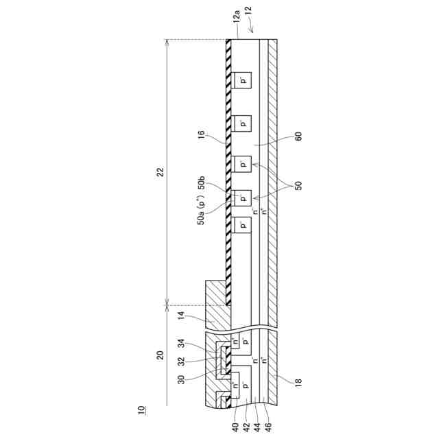 【解決手段】 半導体装置であって、窒化ガリウム系半導体によって構成された半導体基板と、前記半導体基板の上面を覆う電極層と、前記半導体基板の前記上面であって前記電極層の周囲の領域を覆う絶縁層、を有する。前記半導体基板が、前記電極層と前記上面の接触領域の下側に位置する素子領域と、前記絶縁層と前記上面との接触領域の下側に位置する周辺耐圧領域を有する。前記周辺耐圧領域が、前記絶縁層に接するp型耐圧層と、前記p型耐圧層に対して下側から接するn型耐圧層、を有する。前記p型耐圧層が、前記絶縁層に接する上部p型耐圧層と、前記上部p型耐圧層に対して下側から接するとともに前記上部p型耐圧層よりも低いp型不純物濃度を有する下部p型耐圧層、を有する。