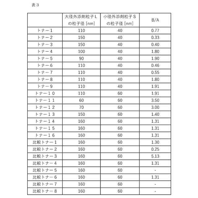 長期使用後にトナーからの外添剤粒子の脱離が起きた場合、感光体表面へ外添剤粒子が移行し、さらに一部はクリーニング工程においてクリーニングブレードをすり抜ける。この結果、外添剤粒子によるすり抜けの多い部位と少ない部位とで帯電工程において潜像電位の違いを引き起こすため、画像濃度の違いとなって現れてしまうことがある(以下、画像濃度ムラと呼ぶ)。このような課題に対して、例えば、特許文献1では、トナーに対して熱処理を施すことによって、外添剤粒子を熱固着させ、長期使用時の安定性を向上させる技術が提案されている。