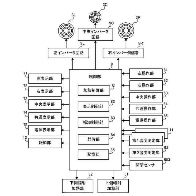 従来、加熱調理器の天板に設けられた表示部において、配置の制約等により、複数の加熱源又は複数の機能に対して、表示を共通化することが知られている。例えば、特許文献1には、誘導加熱調理器の複数の加熱源における同一の機能(タイマー機能)を一つの表示部で表示し、選択等に応じて表示を切り替えることが開示されている。また、特許文献2には、複数の機能(カウントダウン機能とカウントアップ機能)を一つの表示部で表示し、キー操作によって表示を切り替えることが開示されている。